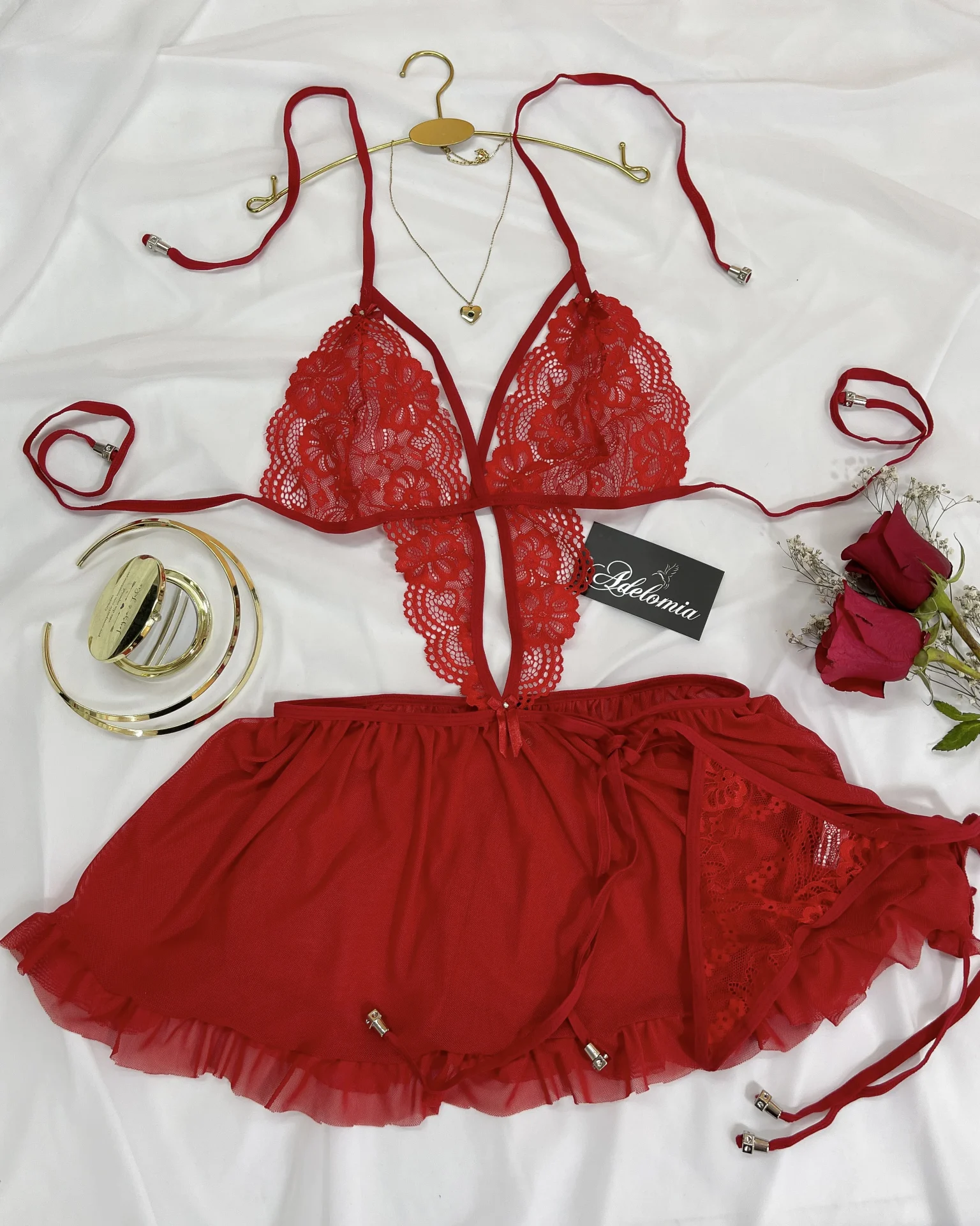 Babydoll en encaje y mallatex de amarrar en la espalda y cuello, también incluye tanga de amarrar a los lados.